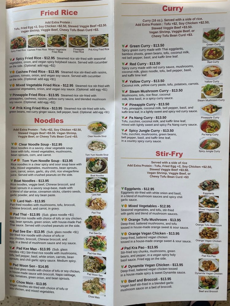 Vegan noodles stir-fried with choice of tofu or soy chicken, and mixed vegetables.