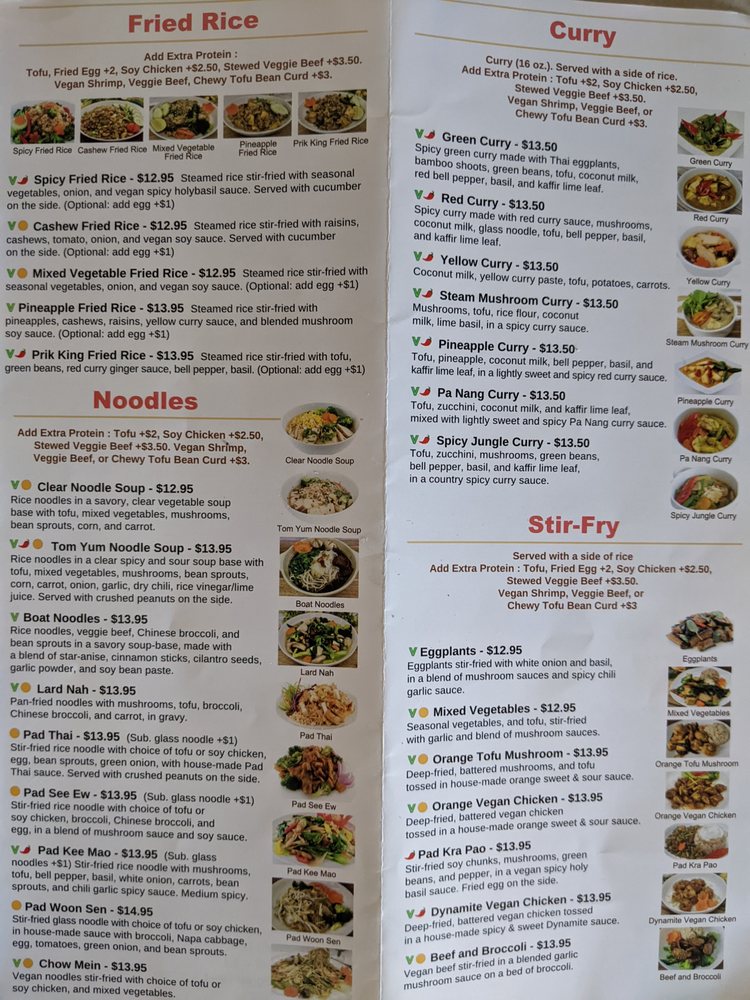 Tofu, zucchini, coconut milk mixed with lightly sweet and spicy Pa Nang curry sauce. Served with a side of rice. Vegan.
